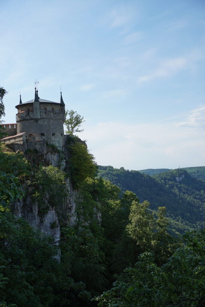 Ein weiteres Highlight ist das Schloss Lichtenstein: Wie aus einem Märchen thront es am Rand der Alb, hoch über dem Echaztal, scheinbar am Felsen festgeklebt. Nicht umsonst wird es das „Märchenschloss Württembergs“ genannt. Es wurde im 19. Jahrhundert im neugotischen Stil erbaut, inspiriert vom gleichnamigen Roman Wilhelm Hauffs. Von den Aussichtsbalkonen schweift der Blick weit ins Albvorland – ein Abstecher, der in Erinnerung bleibt. Da der Albsteig direkt am Schloss vorbeiführt, hat man sowohl die Aussicht vom Schloss als auch auf das Schloss selbst. Nur wenige Meter weiter liegen die Ruinen von Alt-Lichtenstein, deren Tore gerade für Kinder ein spannender Spielplatz sind.